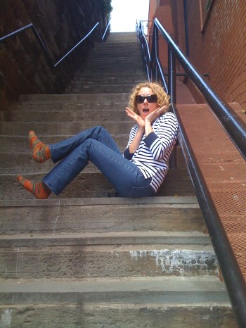 Another day, Stacy Lyn branched out a little further by taking a walk to Georgetown, Virginia. It was a very picturesque town on the river, bustling with shoppers, bicyclists, and tourists, but we preferred the quietude of Rosslyn. Here we are on the steps where a scene in The Exorcist was filmed. Stacy Lyn looks frightened because she thinks she saw a ghost.