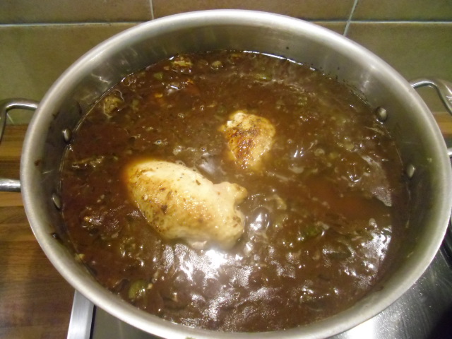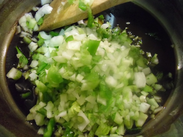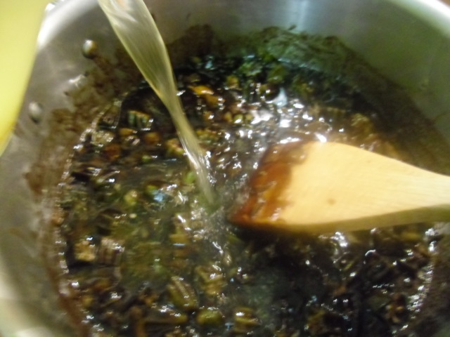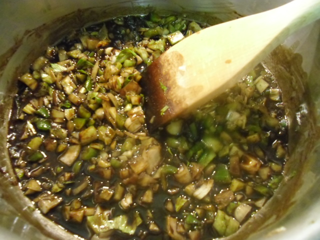 Add the seasonings to the vegetable mixture (except for the filé which will be used later). Add 2 quarts chicken stock or water. I think using an unsalted stock makes the gumbo much more flavorful.