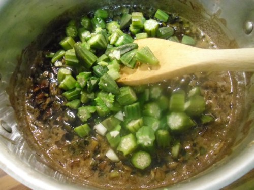 Make a dark brown roux. Add all of the vegetables (except the okra).