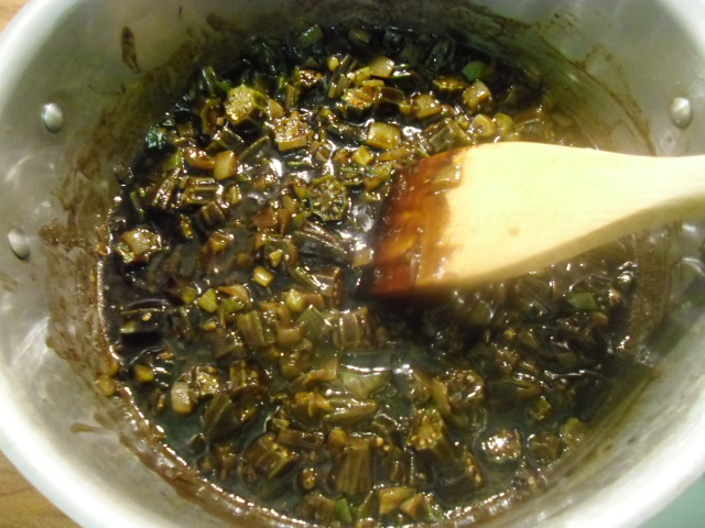 Sauté the okra along with everything else until it is less stringy – about 5 minutes.