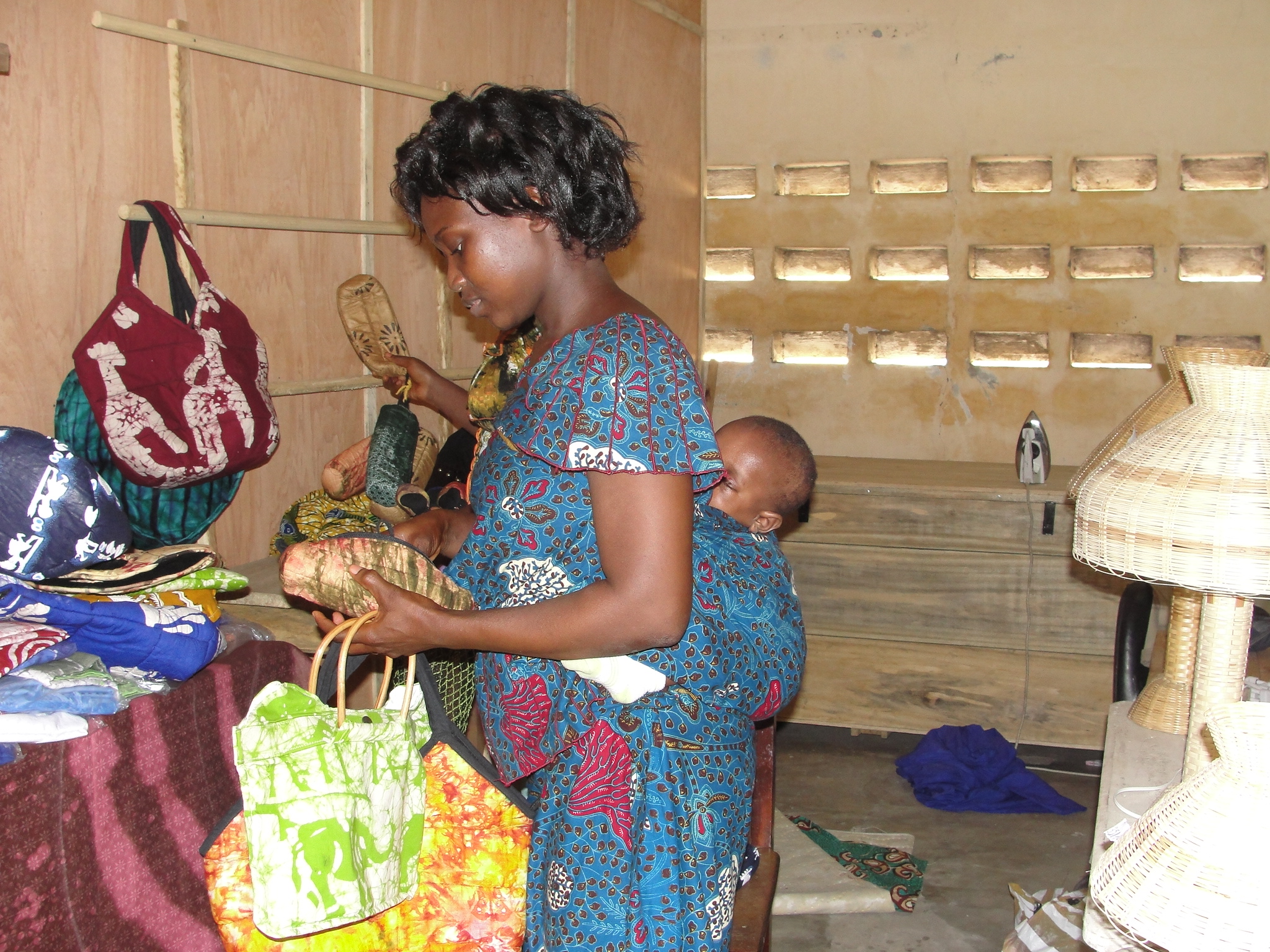 A mother continues her work in the Village Artisanal as her baby takes a nap on her back. No strollers, swings, and daycare centers in Togo: Babies go to work with mothers.