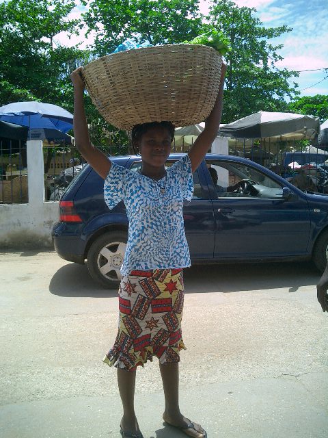 This sweet little girl’s mother sold us some fruits and vegetables. It was the child’s job to carry the produce to the buyer’s car. Education is only free up to the third grade. After that, if parents cannot afford private education, children must work to help support the family.