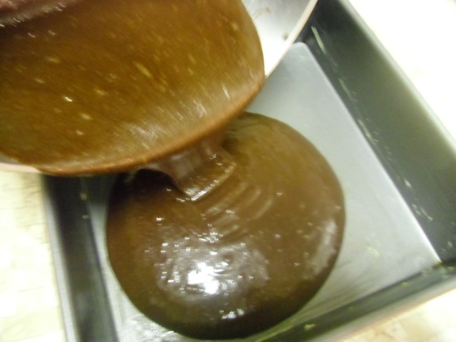 Pour the batter into the buttered pan.