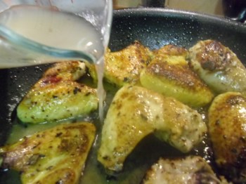 Brown the chicken over a medium-high heat in 2 T olive oil. Add the white wine, and salt and pepper to taste. Lower the heat to medium-low, cover the pot, and simmer for 30 minutes. Baste after about 15 minutes, adding a little water or broth (1/4-1/2 cup) if necessary.