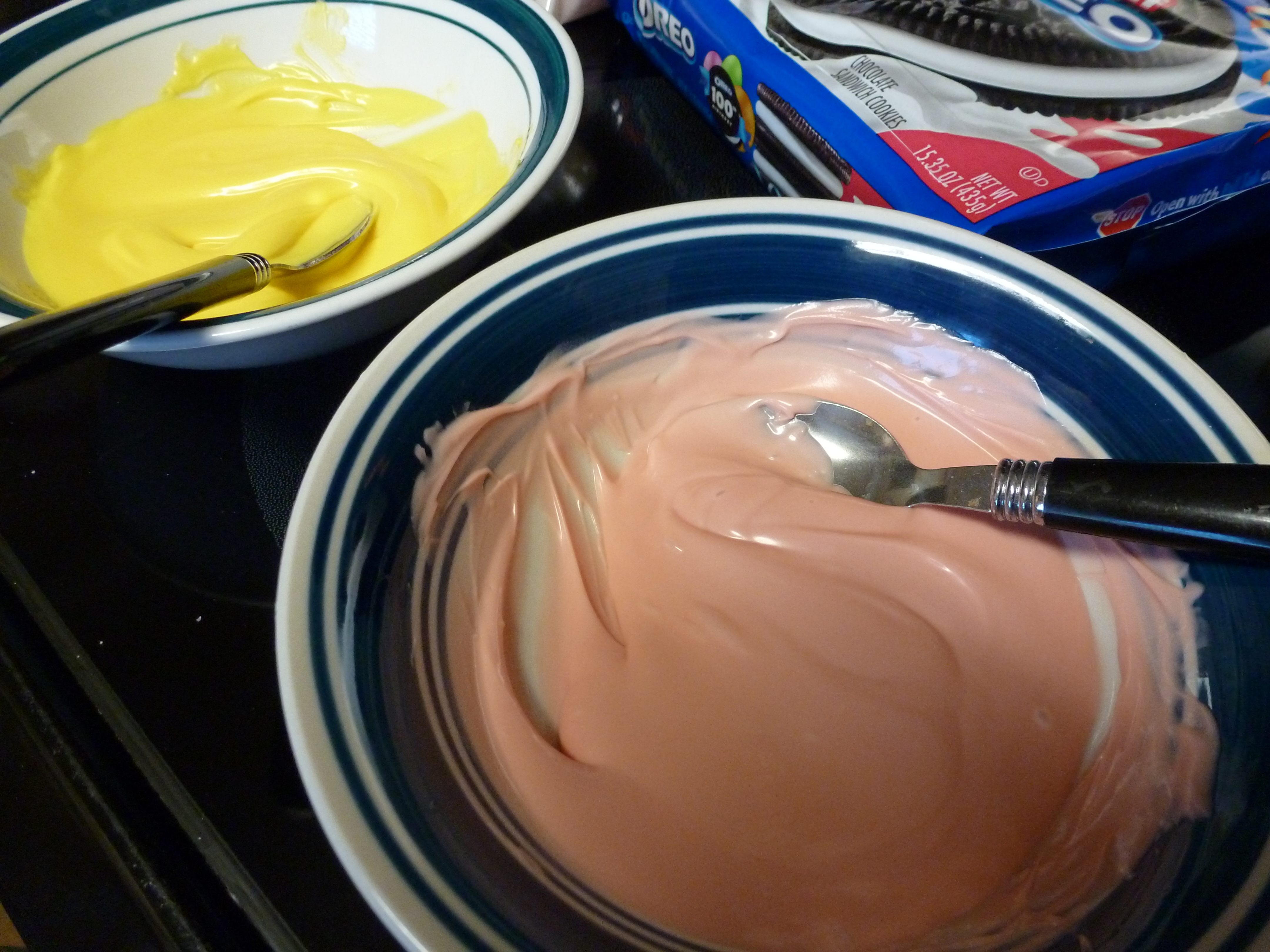 For one pan of cookies, microwave about 1/2 the bag of melts in each of the two colors. (Adjust according to how many colors you will use.) It takes about 1 1/2 minutes to melt half a bag of candy.Fill the pastry bags with the melted candy, and gently squeeze into the candy molds. For these, I filled the impression with one color, then added the contrasting color. Fill the molds about 2/3 full.Gently press an Oreo into each mold.Pop them into the freezer for 10 minutes to harden – and presto! Candy-coated Oreos in pretty pastels for Easter baskets. This could be easily adapted to fit any holiday with a different candy mold and different candy melt colors. And don’t leave them in a hot car…the candy will melt! (So sorry Ethan and Avery! But they still tasted good, right?)