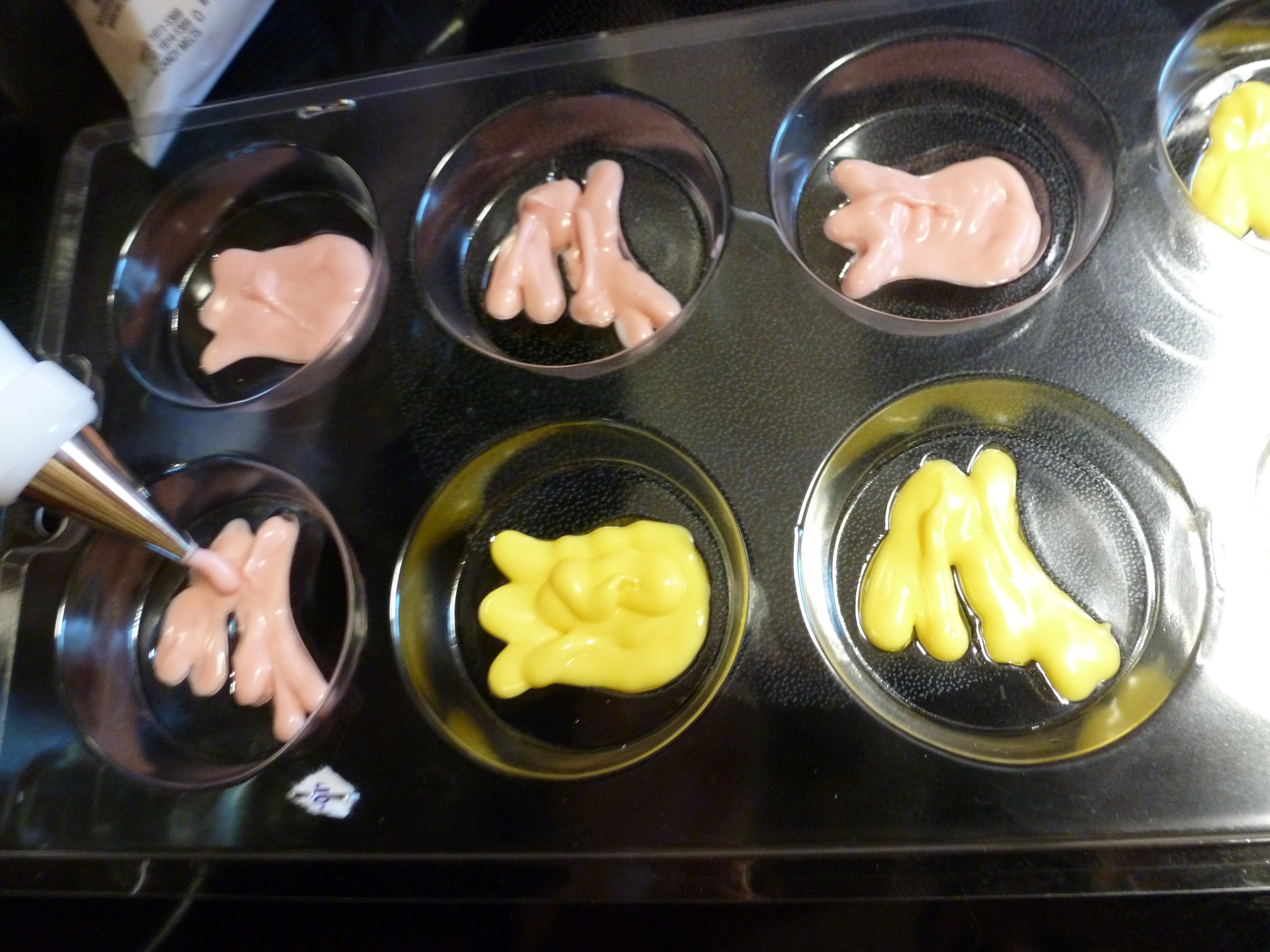 You will also need a pastry bag (1 for each color) with a round icing tip, about a #5. Hint: If you don’t have pastry bags and icing tips, use a plastic bag and cut one of the corners off just enough that the candy squeezes out in a narrow stream.