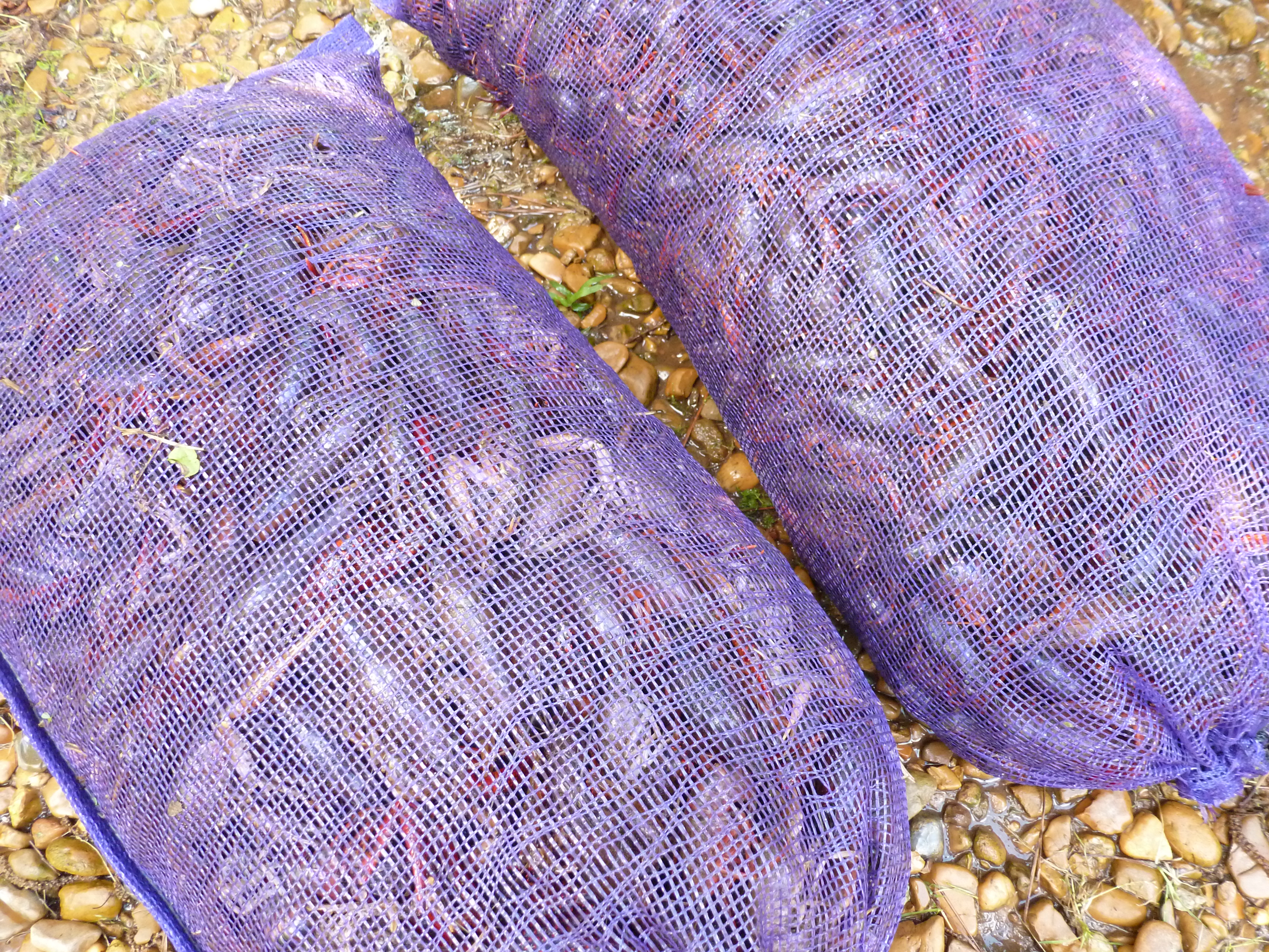 While the potatoes are boiling, “purge” the crawfish – this means to force them to expel their bodily wastes. If you don’t, they will taste like mud – gritty. Hence the name “mudbugs.”  To do this, start by hosing off the crawfish in the sack. Then, empty the sack into an ice chest or a galvanized tub; add just enough to cover the crawfish. Add salt – about 26 oz – to the water and soak them for 10 minutes. Drain the water and repeat (if necessary), depending on how dirty they are.