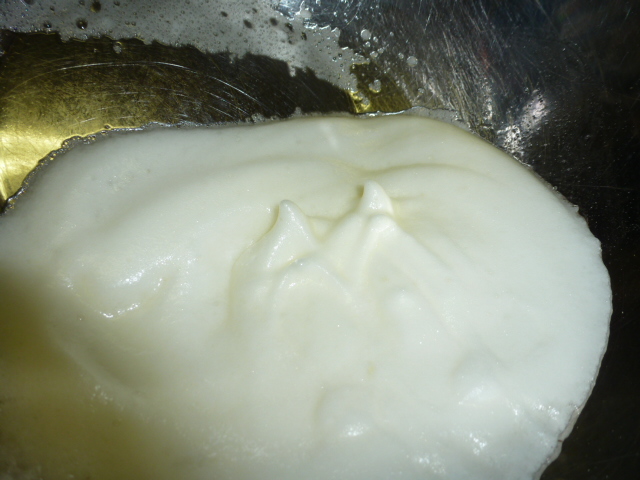 Add vanilla and egg yolks – one at a time – beating after each.