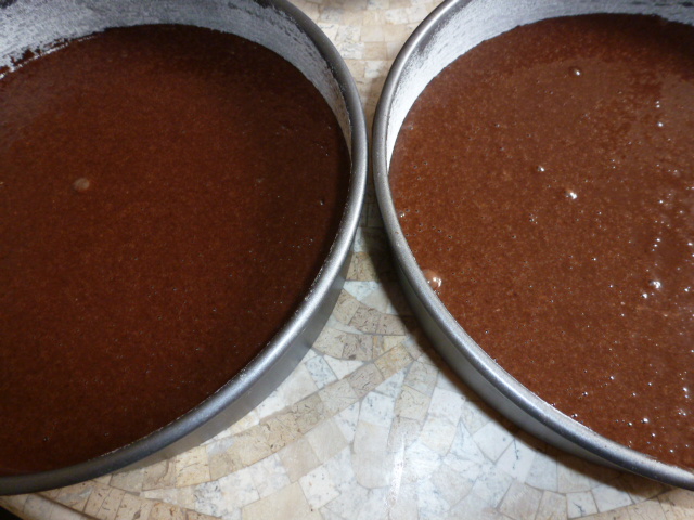 Pour into 2 greased and lightly floured 9 1/2-inch baking pans.