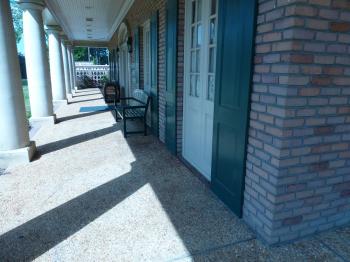 The Welcome Center’s wrap-around porch is typically Southern, with its benches, French doors, and doric columns.