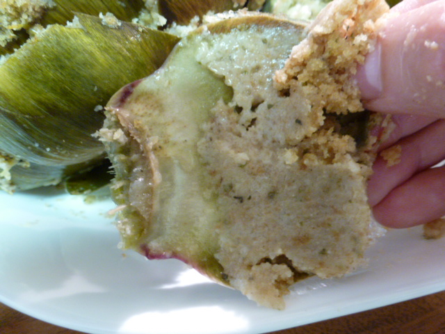 I found these behemoths at the market, and thought they were so beautiful that I would try making two giant stuffed artichokes this time. Learn from my mistake. They took twice as long to cook, plus the hearts had very little flavor. Stick with a normal-sized artichoke.