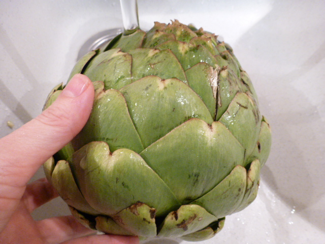 First, hold the artichokes upside down and bang them on a hard, flat surface until they open up. You might need to coax them open a little more with your fingers after pounding them. Soak them in a sink full of water with about 1/2 cup salt for 15 minutes to kill any critters that might be hiding in there. Then remove from the water and rinse.