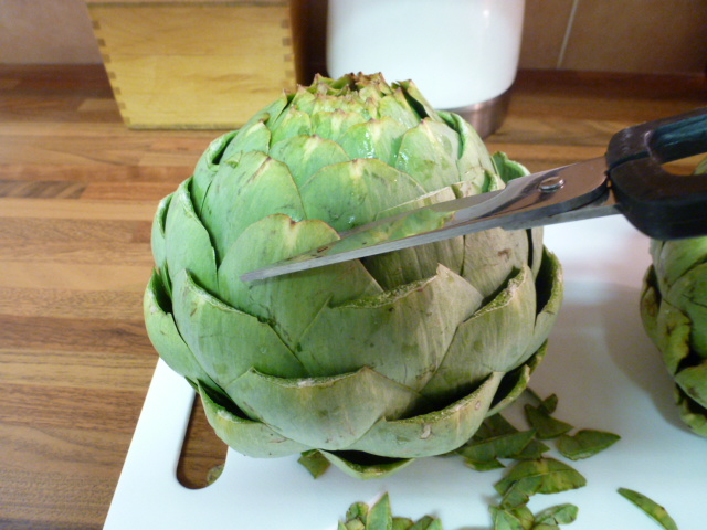If they have long stems, cut those off so that the artichoke will stand upright.