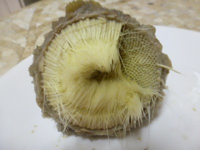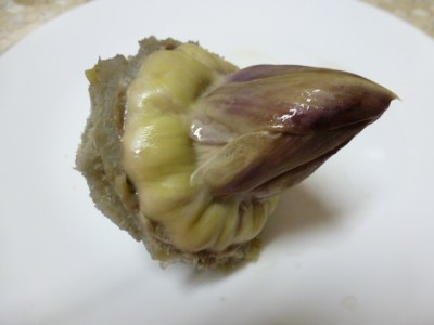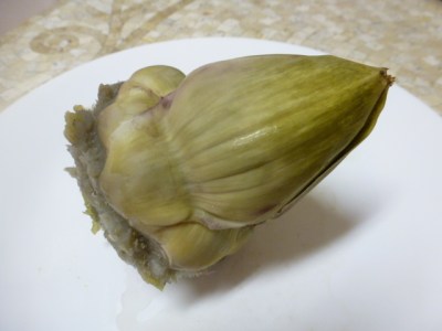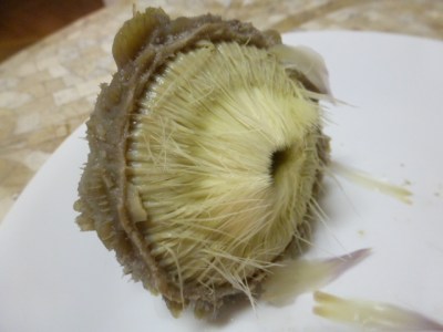 Ok, folks. Remember that delicious stuffed artichoke we make the other day? I hope you didn’t throw the stump away – whether you stuffed your artichoke or simply steamed it, hidden underneath all those leaves is found the best part of the artichoke: the heart.