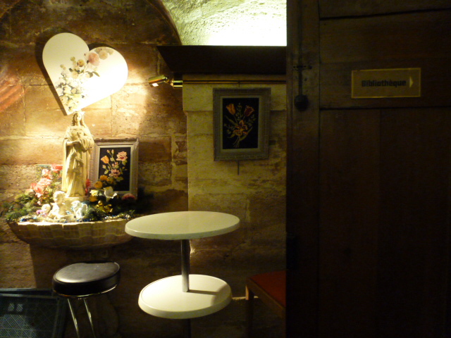 Now let me tell you about my favorite quirk of this quirky church: Le Foyer, the restaurant secretly tucked beneath the church itself. Because the perron is raised ten feet off the ground, there is plenty of room under there for a café.