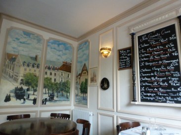 The fresco depicts a Chartres of days gone by, while the sconce not only illuminates the wine menu written on the chalkboard but also warms the room with its charm.