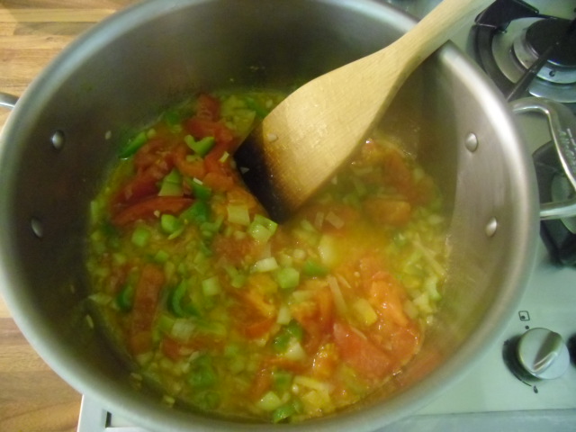 Sauté the vegetables in the 2 T oil over a medium heat until the onions are soft and transparent, about 3 minutes.