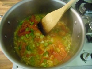 Add all of the above-listed ingredients (except for the broth) to the sautéed vegetables.