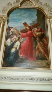 Hanging on the wall just outside her apse, a painting depicts one of the stations of the Cross – where Jesus was consoling the despairing women. He was saddled with a wooden rood, struggling to carry the instrument of his own torture. Yet his humanity extended beyond his own suffering. He was more concerned about theirs. Who among us can rise to this level of enlightenment? It’s possible, I suppose. That’s what he wanted us to see in ourselves.