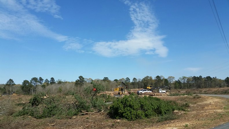 The land has been denuded of the trees on the country road leading to my house. The logs are being loaded onto awaiting trailers and taken to mills. They’ll be pulverized and recast as paper.