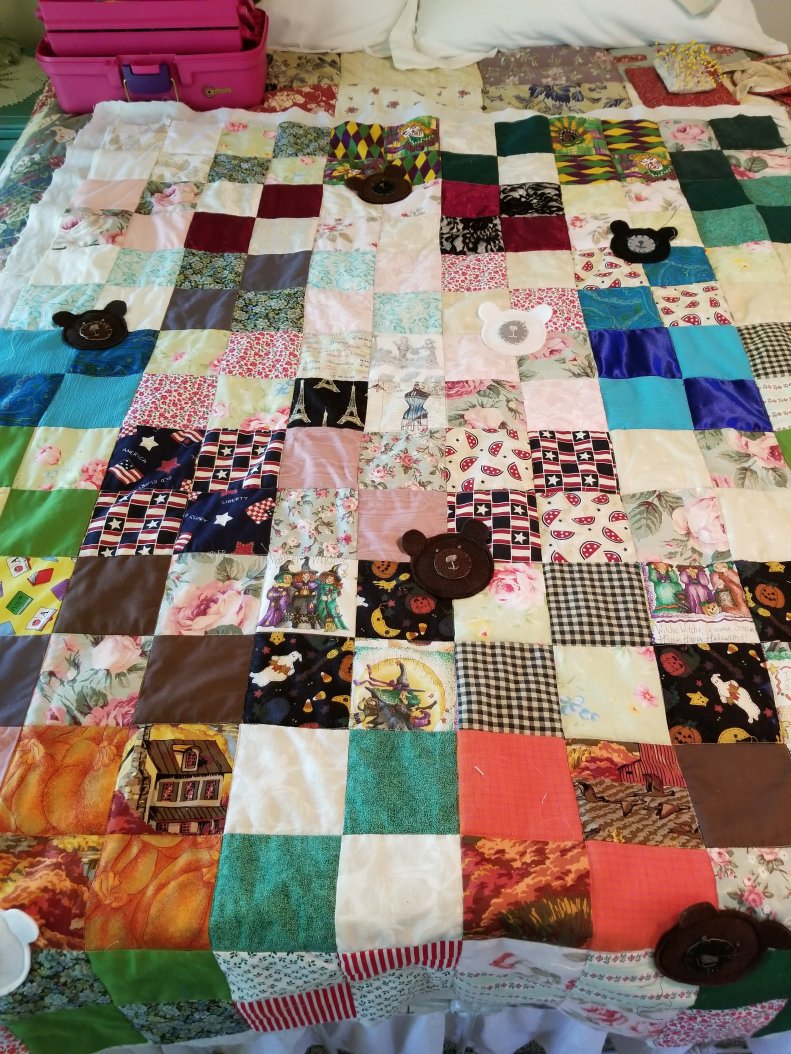For years, after I finished sewing a dress or costume for Jillian, I cut out 4×4 squares from the fabric remnants in the hope of one day putting together a quilt as a memory of her childhood. As with most things that were precious or sentimental to me, Katrina stole almost all of the squares. For the past fifteen years or so, I’ve lugged around a bag of those few that survived The Storm. They’ve been around the world. But it was finally time to become one, and to settle down in one place with a different girl.