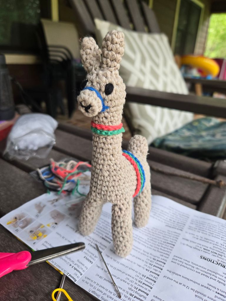 Baby Sister is expected to arrive this August, and though we experience quite a protracted heat that time of year in Louisiana, our new baby will need her own layette to get her started – a blanket and a cap for the indoors to shield her from air conditioning. Of course, I could not, would not forget her big sister – Granddaughter – so I crocheted a little surprise for her, too: an animal that she doesn’t yet have in her menagerie – a llama. Who doesn’t love llamas?