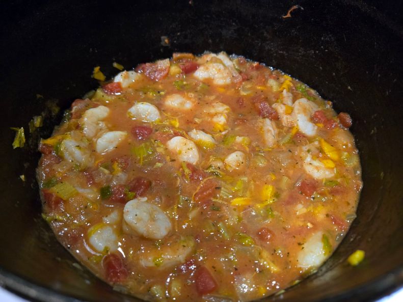 - Add the shrimp and mix with vegetables and roux. Stir until they begin to turn pink, a minute or two.