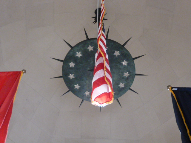 At the base of the flag pole, helmets rest atop olive branches –